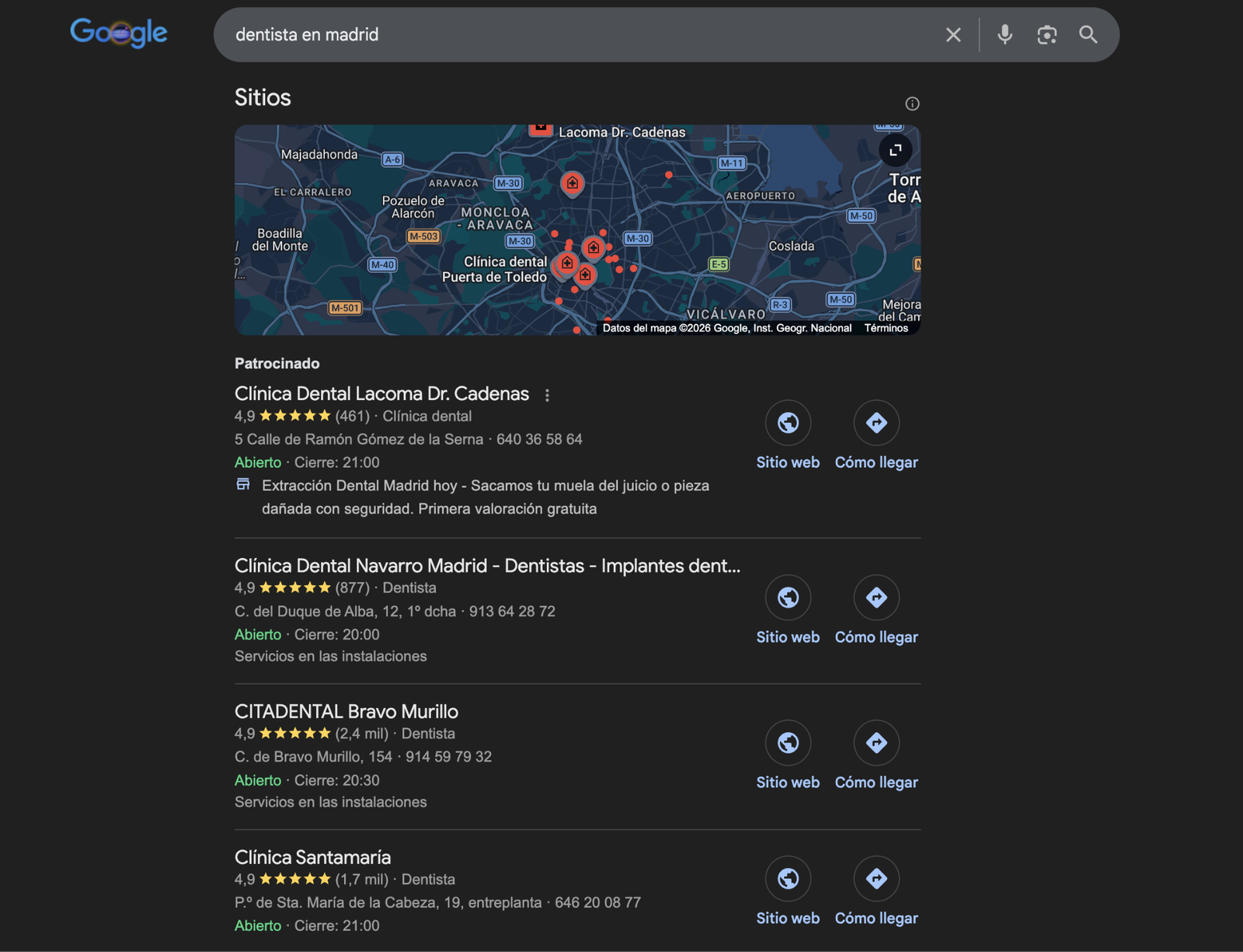 El SEO local consiste precisamente en acotarlo. En lugar de «tratamiento de ortodoncia», escribe «tratamiento de ortodoncia en Málaga». En lugar de «clínica dental», «clínica dental en el centro de Málaga». Parece obvio, pero el 80% de las webs de clínicas dentales no lo hace de forma consistente.